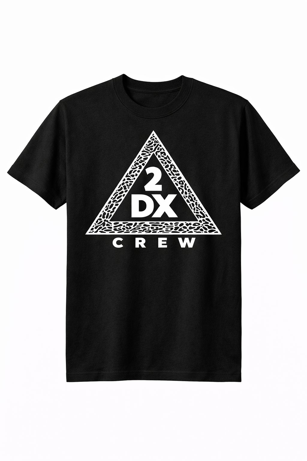 Represent the crew with the 2DX Crew Classic Logo Tee, a clean and bold streetwear staple designed for everyday wear. This black T-shirt features the signature 2DX Crew triangle emblem printed in crisp white across the chest, creating a strong contrast against the deep black fabric.